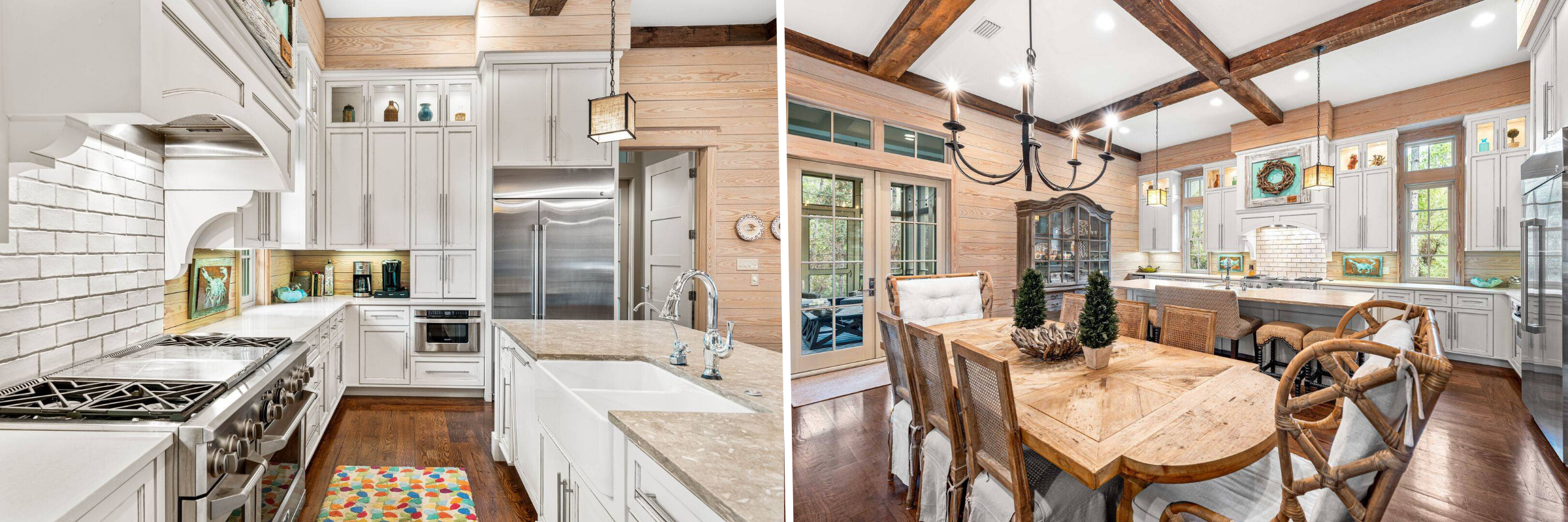 Designed with large families and groups in mind, 25 Rain Lily Lane has seven bedrooms and six and a half bathrooms for 14 guests. One of the best features of the home is the chef’s kitchen, complete with professional-grade appliances, a beverage refrigerator, and a stand-alone icemaker. The kitchen opens up to a large dining space, making hosting during the holiday season a breeze.